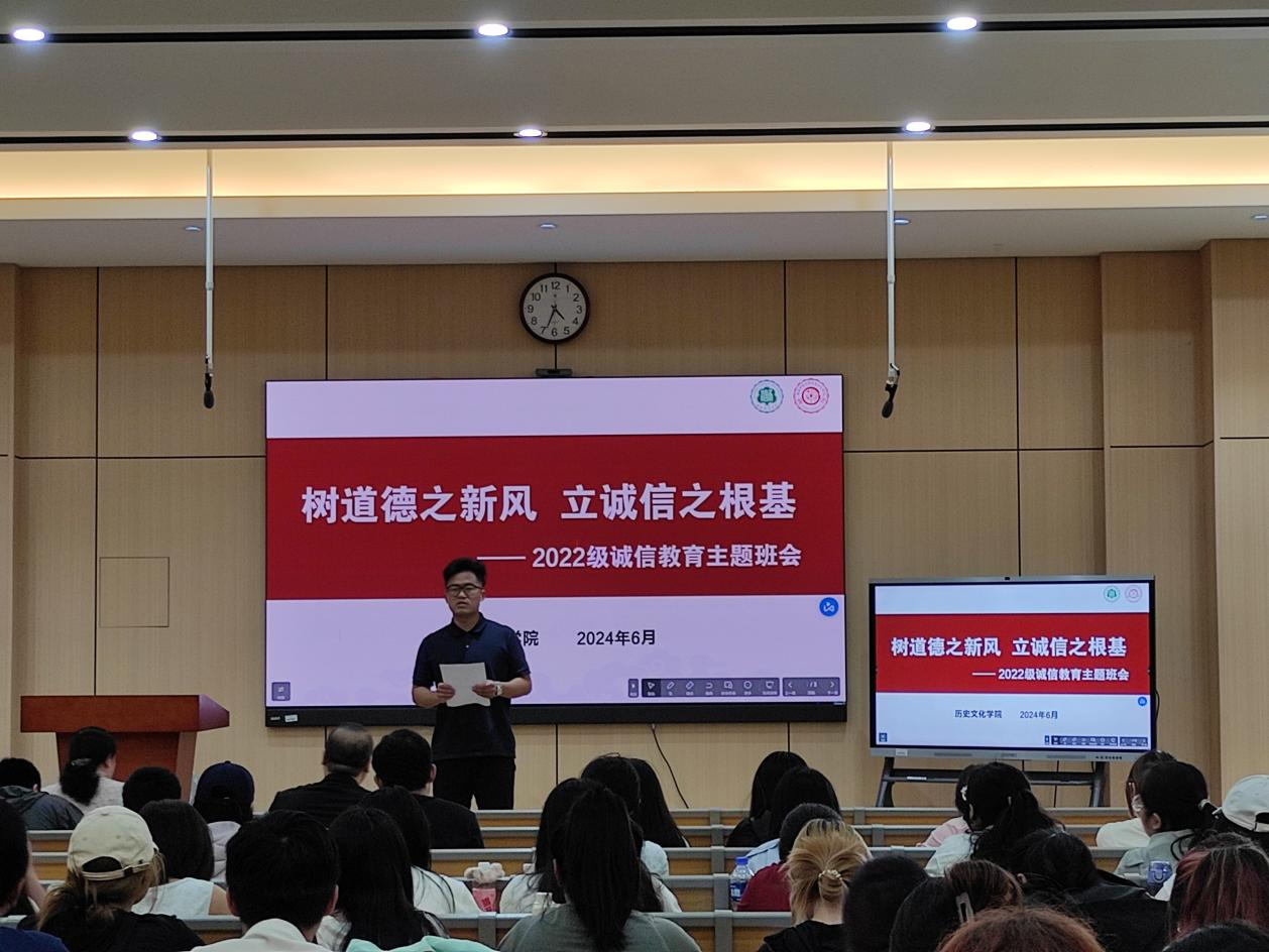 为进一步落实立德树人根本任务,弘扬诚信文化,引导大学生树立诚信意识,提高学生的思想道德素质,营造优良的学院学风氛围。海南师范大学历史文化学院于2024年6月26日下午在第二公共楼109召开2022级诚信教育大会。本次诚信教育大会由历史文化学院学工办主任郭雷鸣主持,历史文化学院党委书记王志强、党委副书记王国英、辅导员伊鑫迪以及武刚、程涛和孟二壮三位班主任参加。