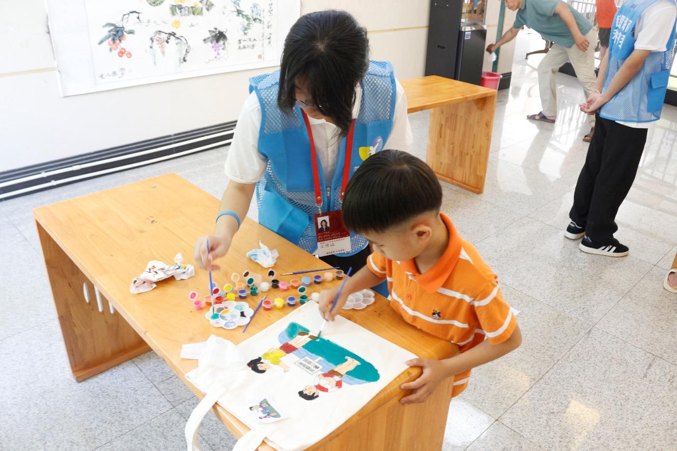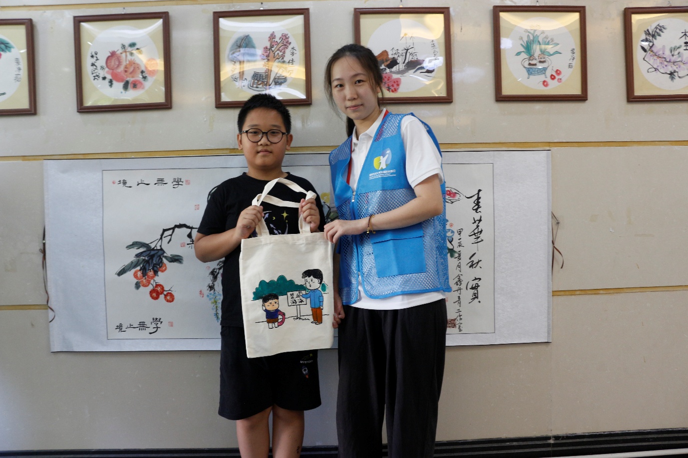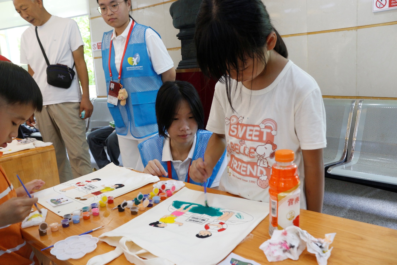 活动现场,一张张印着防溺水场景的帆布袋被分到孩子们手中 —— 有戴着救生圈的卡通小人、有 “水深危险,禁止游泳” 的警示标志、有小伙伴互相提醒远离深水区的画面。当画材被一一分到每个小朋友们的手中时,活动正式拉开了序幕。