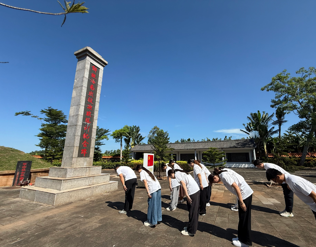 活动现场,全体师生在解放海南战役决战胜利纪念碑前整齐列队。在庄严肃穆的氛围中,师生们向纪念碑三鞠躬,以庄重的姿态传递对革命先辈的深切追思与崇高敬意。