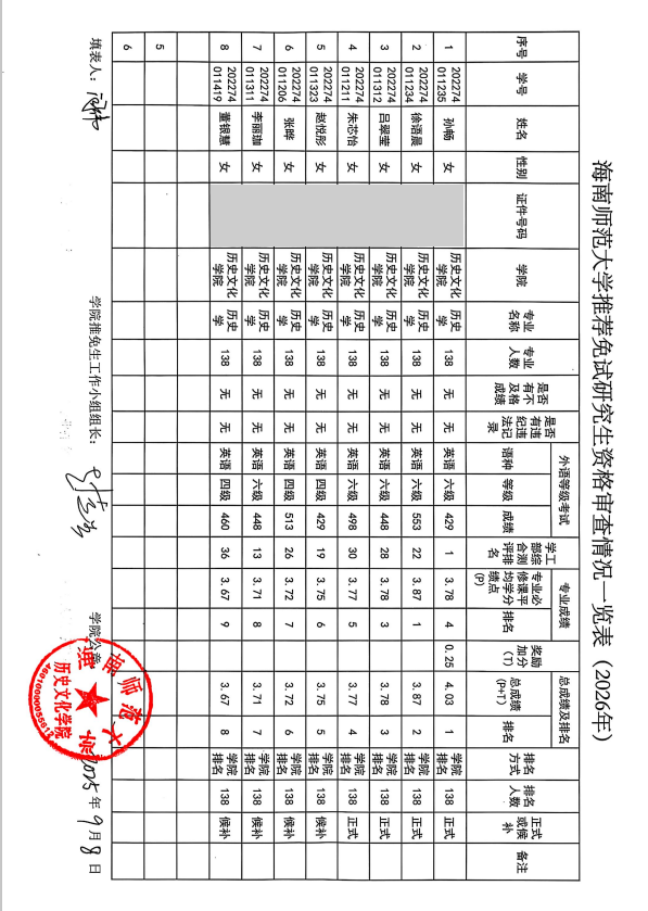 根据《海南师范大学推荐优秀应届本科毕业生免试攻读硕士研究生工作实施办法》(以下简称《推免工作管理办法》)的相关规定,《历史文化学院推免工作方案》(2025年9月修订)以及《海南师范大学关于做好推荐2026年应届优秀本科毕业生免试攻读硕士学位研究生工作的通知》的要求,经学生个人申报,学院推免工作小组审查,现将历史文化学院推荐2026届优秀本科毕业生免试攻读硕士研究生资格审查及奖励加分结果予以公示。