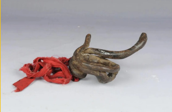 另一件文物是黎族蛇形道公用具,它承载着黎族独特的文化与信仰。蛇是黎族崇拜的图腾,被视为始祖。《古今图书集成》中《琼州府》记载:“定安县故老相传,雷摄蛇卵在黎山中,生一女,号为黎母,食山果为粮,巢林为居。”黎母被认为是黎族的先祖。历史上,黎族喜欢在身上纹饰与蛇有关的图案,生活中也常将蛇形标志挂在门楣上、戴在脖颈上或织绣在衣服上,以祈求平安。此外,墓地周围的蛇被视为祖先灵魂的显现,神圣不可侵犯。