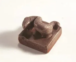 朱庐执刲印是一枚银质方形印章,出土于海南省乐东黎族自治县。印钮是一条蛇,蛇头微微上扬,蛇身布满精美细密的花纹,印面铸有阴文篆书“朱庐执刲”四字,工整严谨,制作精致,造型奇特,具有极高的历史研究价值。