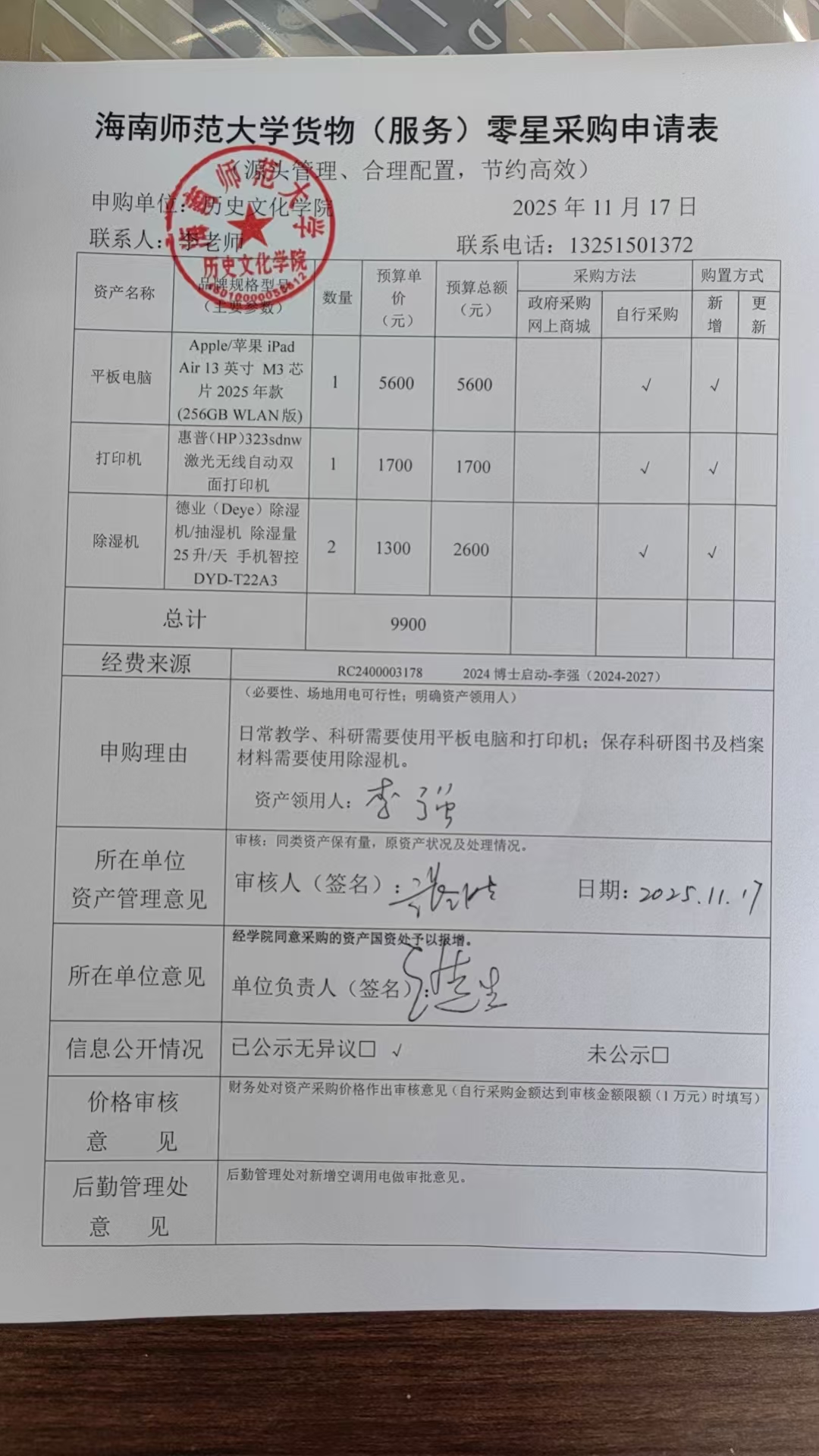 关于李强老师购置平板电脑、打印机、除湿机的公示