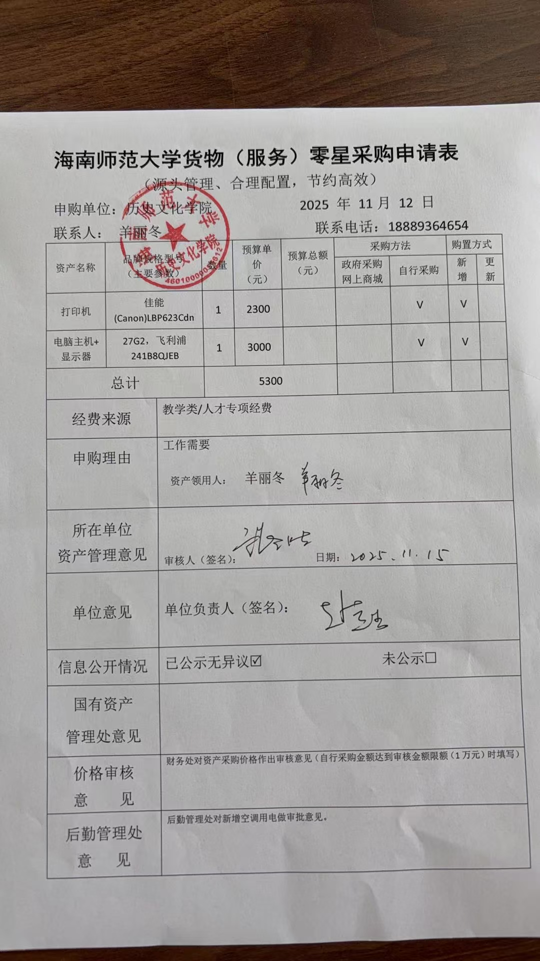 关于羊丽冬老师购置打印机、电脑主机与显示器的公示