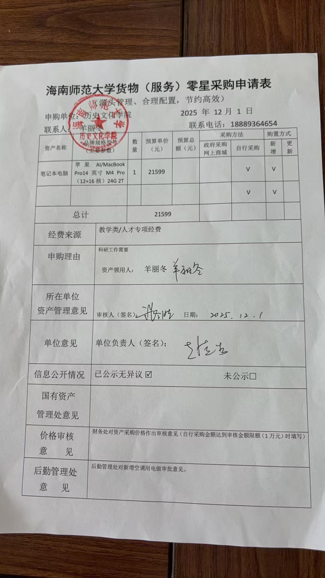 关于羊丽冬老师购置笔记本电脑的公示