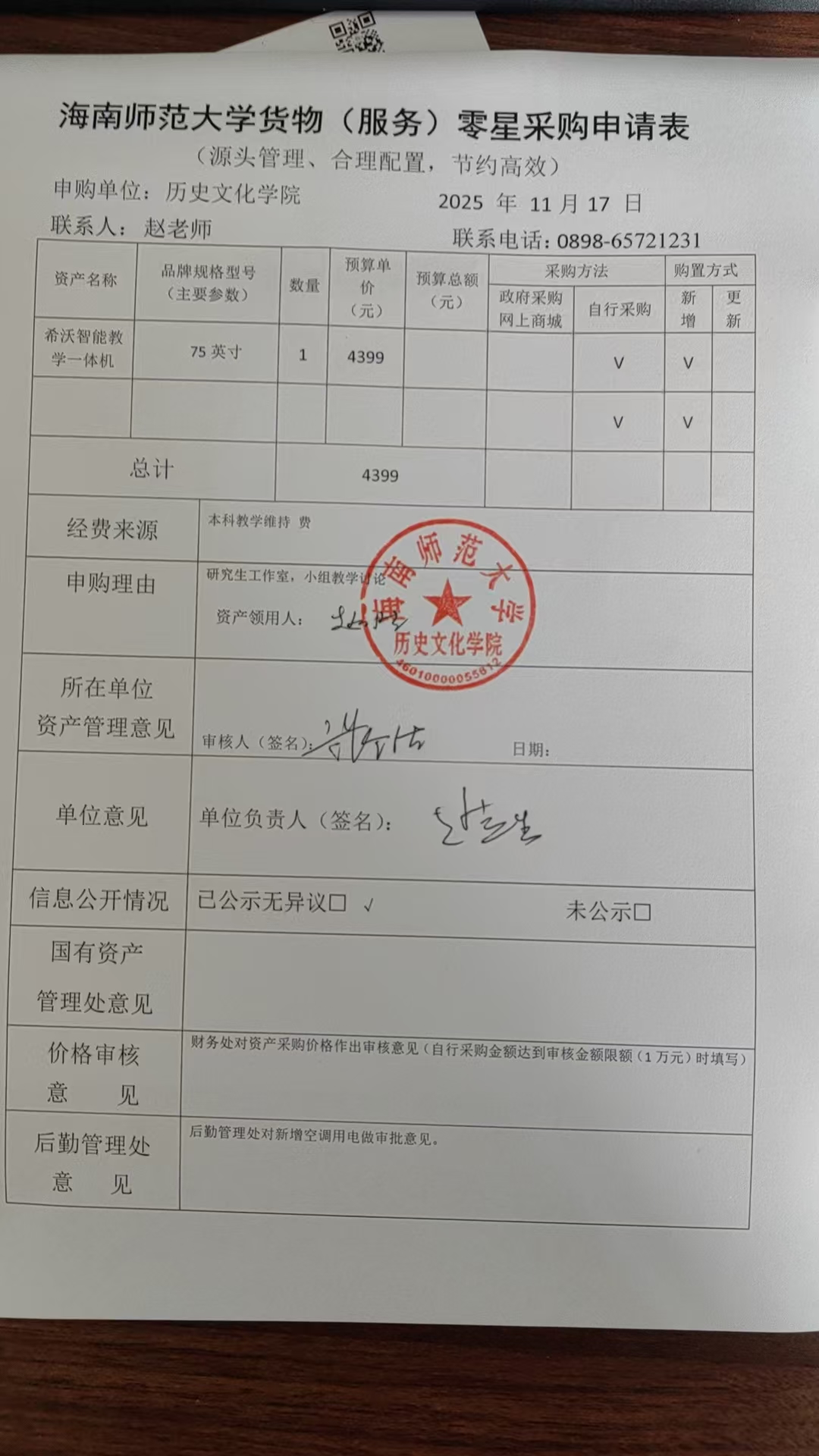 关于赵从胜老师采购教学一体机的公示