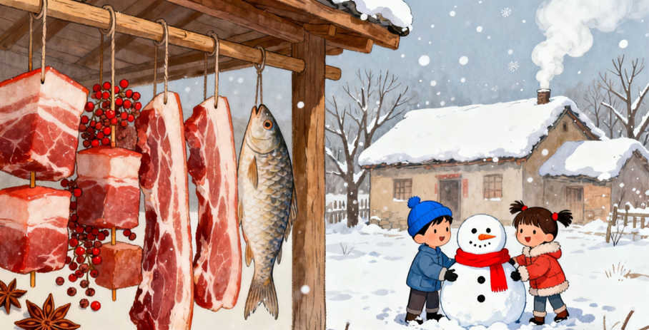 腌肉储食:“小雪腌菜,大雪腌肉”,这是民间流传已久的习俗。家家户户挑选新鲜猪肉、鱼肉,用盐、花椒、八角等调料腌制后,挂在通风处风干。经过时间酝酿,腌肉香气浓郁,不仅是春节餐桌上“丰年留客足鸡豚”的美味,更承载着人们对丰收的喜悦与对来年的期盼。