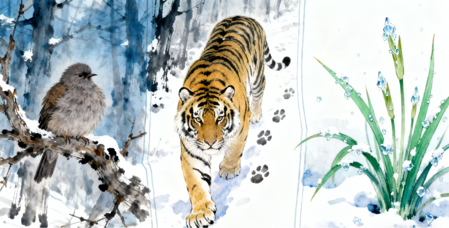 二候虎始交:即便“霜风卷地寒侵骨”,阳气已悄然萌动。老虎作为百兽之王,此时能感知到这微弱的生机,开始交配繁殖,为生命延续播下希望。
