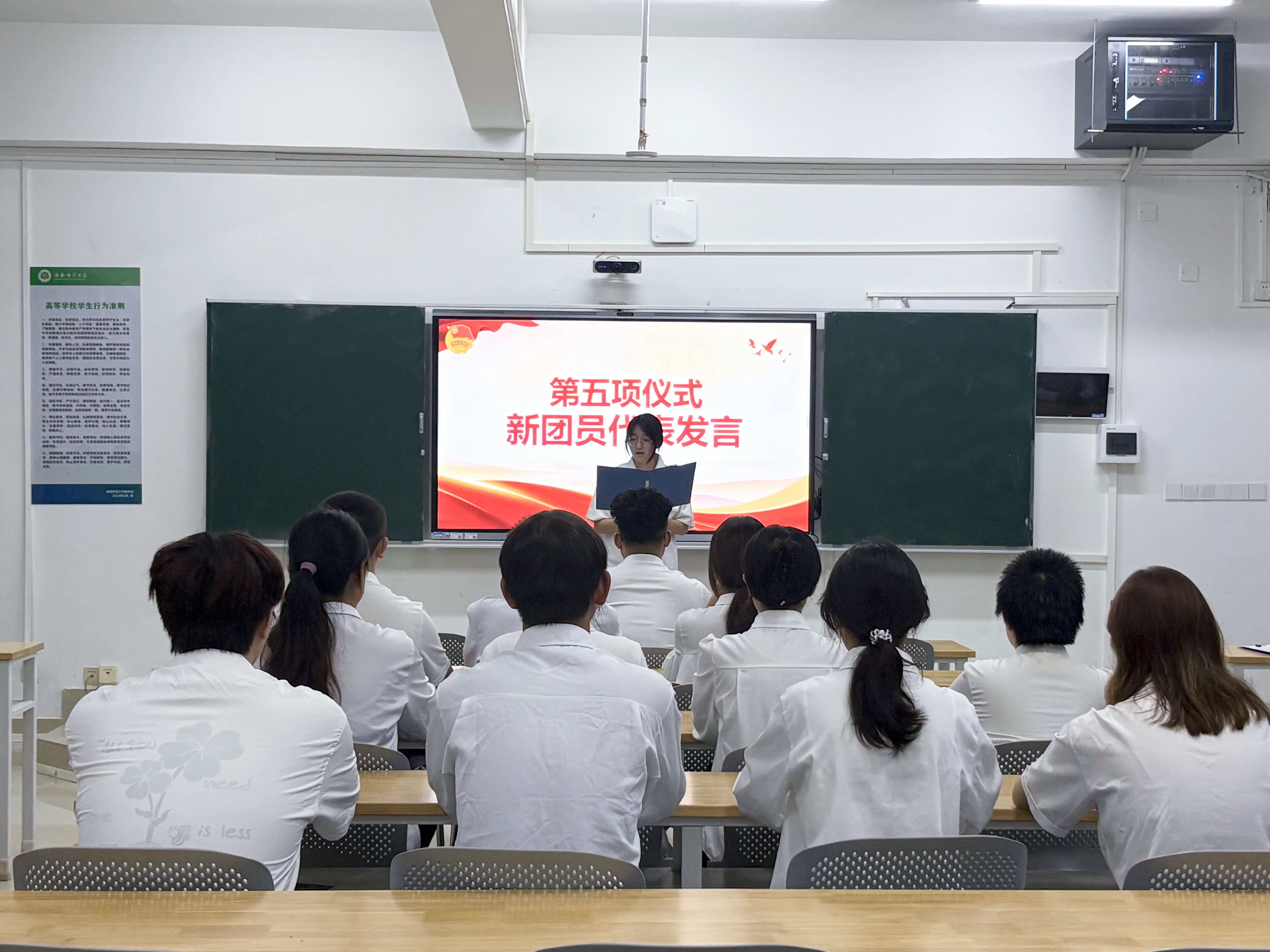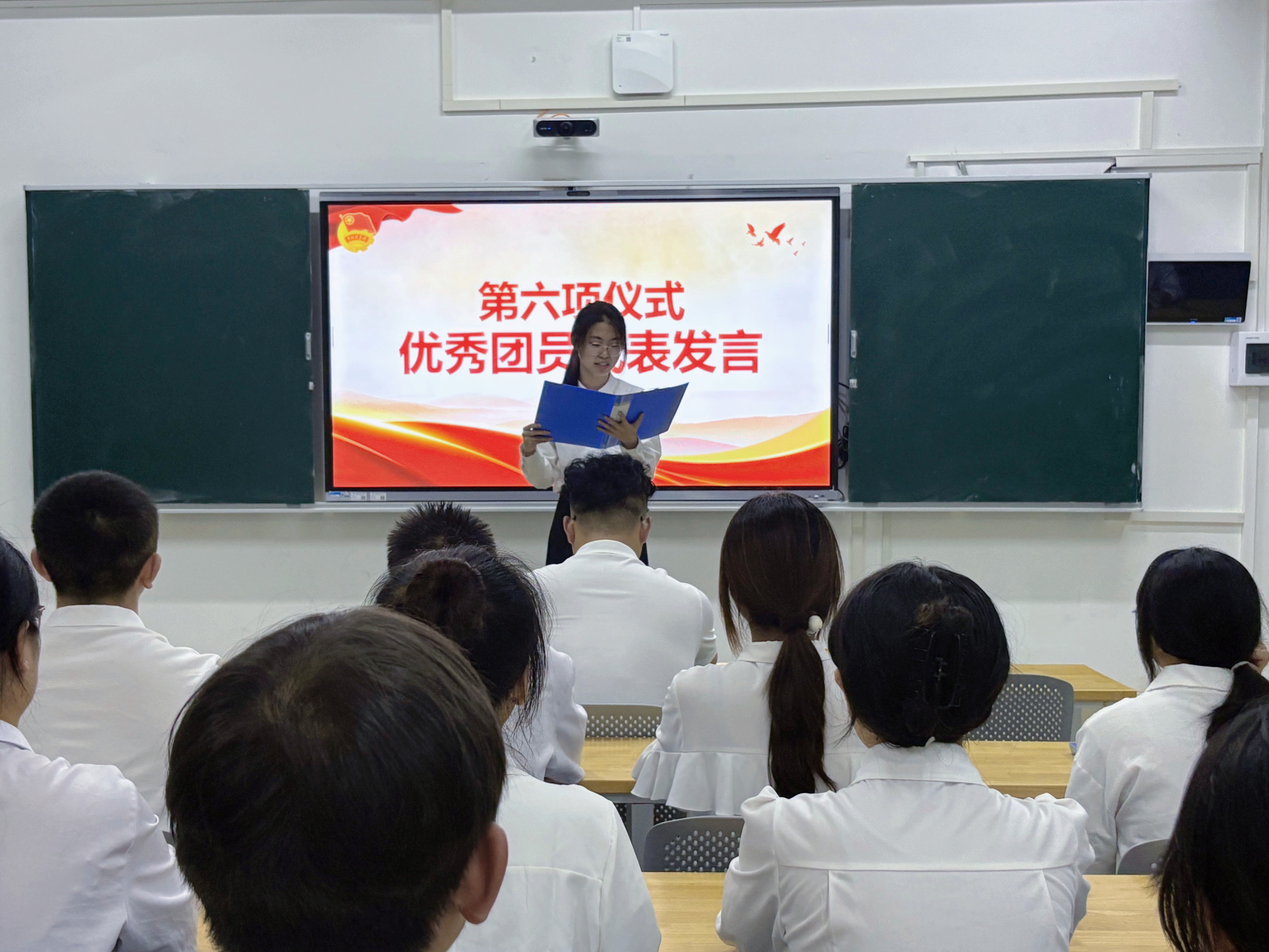 新团员代表朱泓朵同学与优秀团员代表刘依婷同学先后发言。他们结合自身成长与学习经历,分享了成为共青团员的光荣与自豪感,并表示会继续以团员标准严格要求自己,勤奋学习、锤炼本领,在学习与生活中积极发挥先锋模范作用。