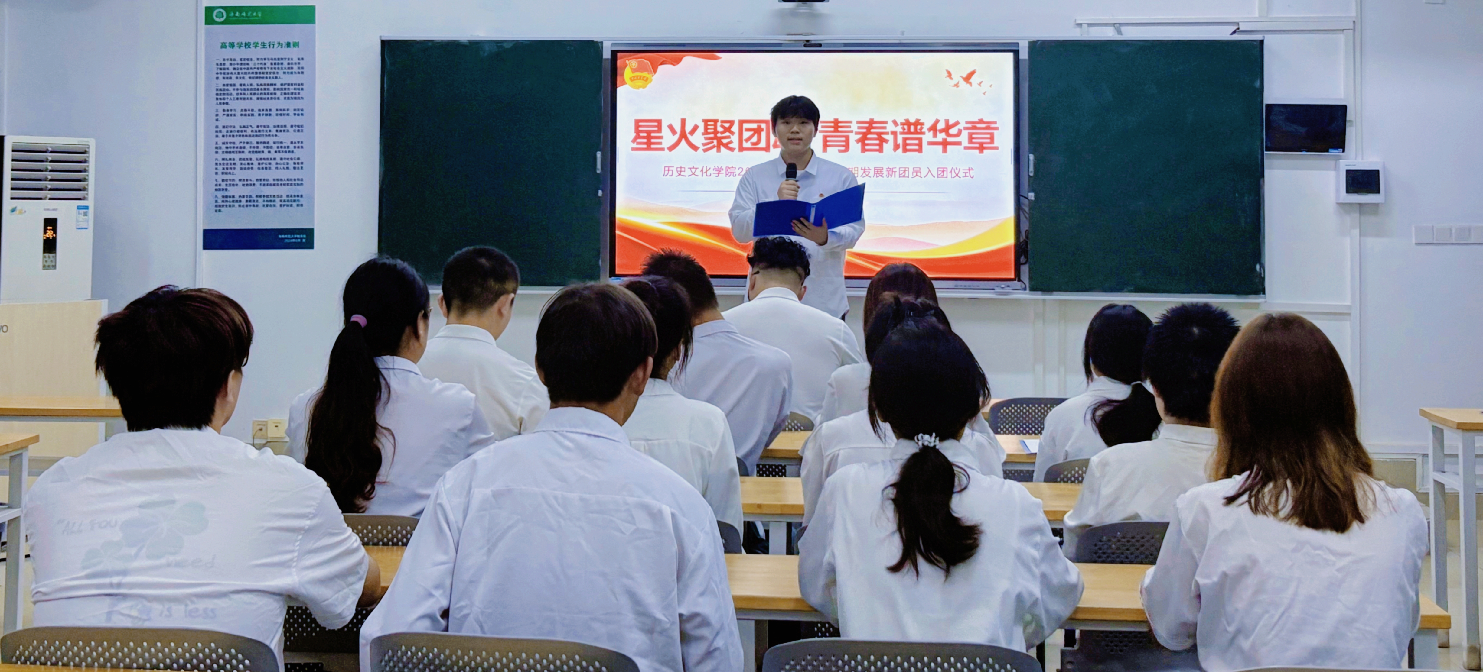 为进一步加强团员队伍思想政治建设,切实提升团员青年的政治觉悟与使命担当,引导广大团员坚定理想信念、厚植家国情怀,增强团组织的先进性与凝聚力。海南师范大学历史文化学院于2025年12月2日晚21:00在第一公共教学楼601教室举行2025年下半年新发展团员入团仪式。团委书记郭雷鸣老师出席本次入团仪式,2025下半年全体新发展团员参与,仪式由郭忠锐同学主持。