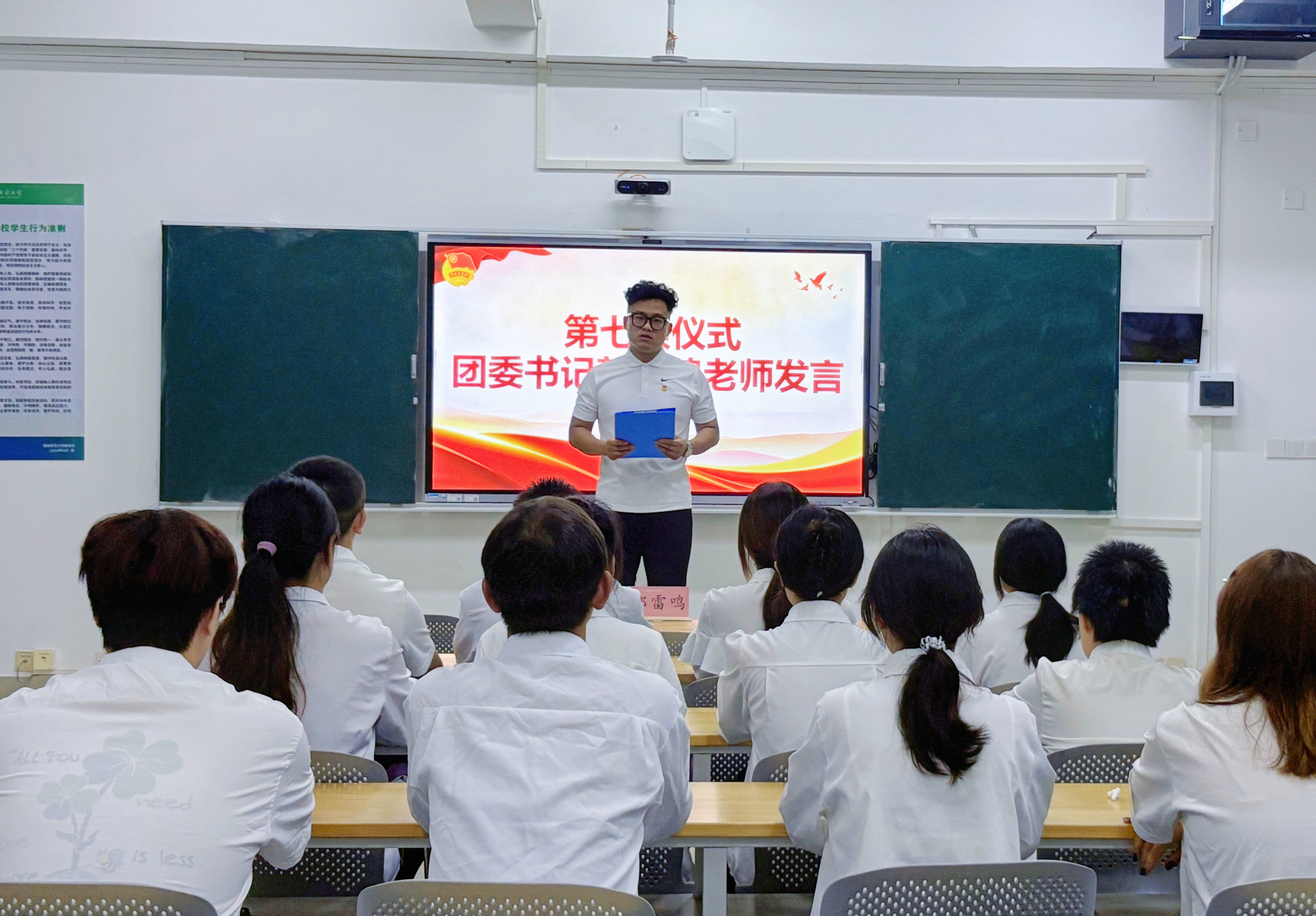 团委书记郭雷鸣老师在发言中向全体新团员表示热烈祝贺,并寄予殷切期望。他鼓励新团员们要坚定理想信念、牢记入团初心,不断增强责任感和使命感,努力成长为有理想、敢担当、能吃苦、肯奋斗的新时代好青年。
