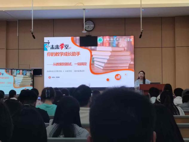 培训伊始,罗老师以“你的教学成长助手——从教案到面试,一站搞定”为主题,点明了“未来学堂”平台的核心定位与服务价值。结合师范生在学习中普遍遇到的痛点,如备课素材匮乏、教资备考资源不足等问题,系统介绍了平台的功能框架与资源体系,让同学们清晰认识到数字化工具对提升教学能力的作用。